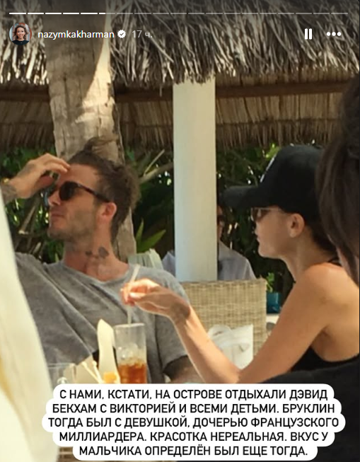 В серии сториз Назым рассказала, что на отдыхе Бишимбаевы оказалась на одном острове вместе с бывшим капитаном сборной Англии по футболу Дэвидом Бекхэмом и его супругой модельером и экс-участницей группы Spice girls Викторией, которые сейчас оказались в центре скандала с участием своего старшего сына Бруклина.