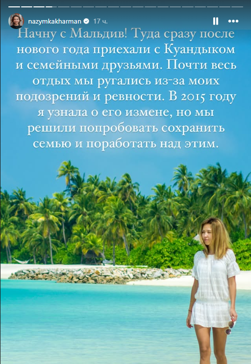 Кахарман сообщила, в тот год переживала измены мужа. По ее словам, о неверности супруга она узнала в 2015 году, но пара решила сохранить семью и работать над отношениями. Однако, усилия прикладывала, по словам Кахарман, только она.