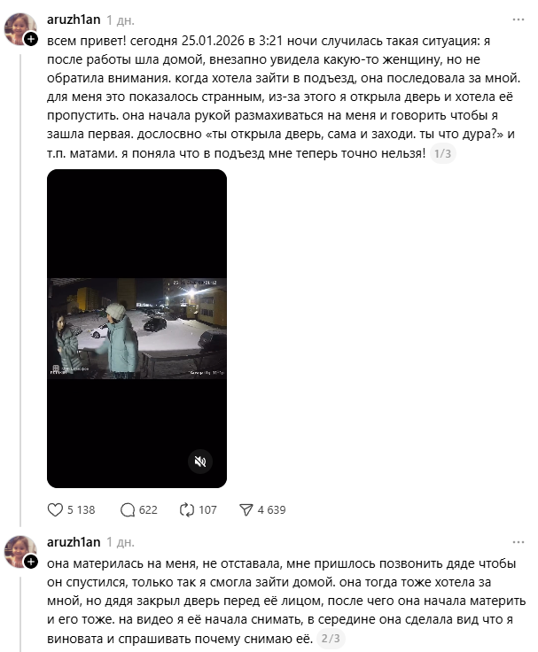 В социальной сети Threads автор сообщила, что инцидент произошел 25 января 2026 года около 03:21. Возвращаясь, домой после работы, девушка заметила неизвестную женщину, которая, по ее словам, последовала за ней к подъезду.