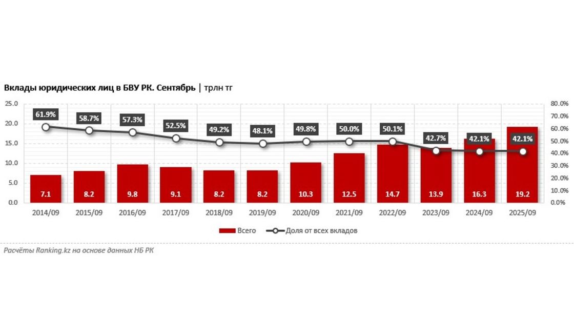 Вклады юридических лиц в казахстанских банках достигли 19,2 трлн тг — плюс 3,3% за месяц и плюс 17,9% за год, сообщает Ranking.kz со ссылкой на данные Национального Банка РК. Более 87% совокупного объема депозитов бизнеса пришлось на топ-10 БВУ РК в секторе. Доля вкладов юрлиц в общем объеме депозитов в казахстанских банках составила 42,1%. На этом уровне (41%–43%) показатель держится уже третий год.