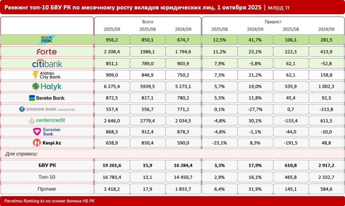 Абсолютным лидером месячного роста среди крупнейших БВУ РК стал Bank RBK: плюс 12,5%, до 956,2 млрд тг. Для сравнения: в целом по топовой десятке банков месячный рост составил 2,9%. Примечательно, что в годовой динамике по росту вкладов бизнеса лидирует также Bank RBK (плюс 41,7%, при росте в целом по топ-10 БВУ РК на 16,1%). Таким образом, позитивная динамика банка, указывающая на доверие предпринимателей к этому фининституту — стабильный тренд.