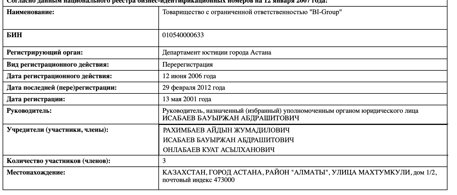 Однако в том же 2001 году появилась новая компания с тем же названием – «АБК-Курылыс». В 2006 году она тоже превратилась в ТОО «BI Group». Первоначально ее учредителями была все та же тройка. Но потом акционеры сменились. А в 2019 году компанию переименовали в "Jazz Restoran", а затем ликвидировали. Но перед этим ТОО «BI Group» успело набрать кредитов на сумму более 5,7 млрд тенге.