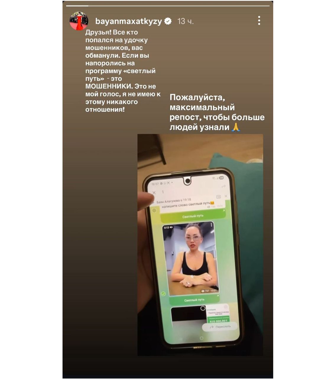 Известный казахстанский продюсер и актриса Баян Алагузова обратилась к пользователям соцсети с важным предупреждением о действиях мошенников, передает NUR.KZ.