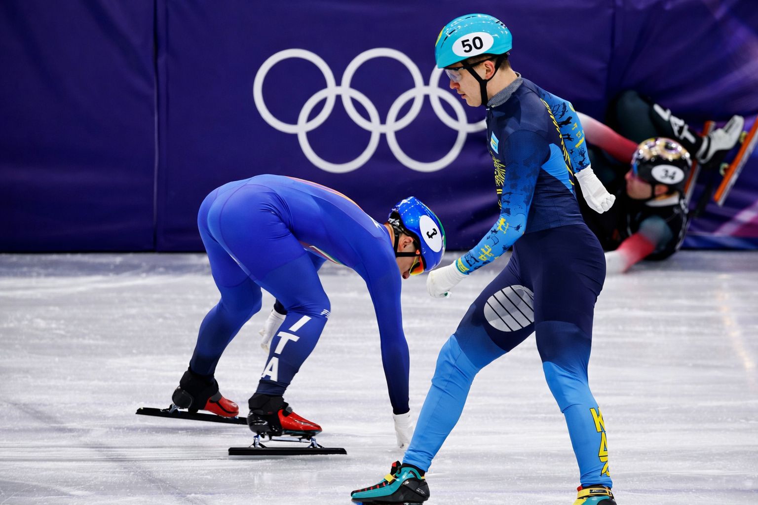 Казахстанский шорт-трекист Абзал Ажгалиев находился на последней позиции большую часть дистанции. Однако в финальной части заезда двое соперников столкнулись, задев и итальянского спортсмена, который пересек финишную линию спиной вперед.