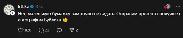 “Нет, маленькую бумажку вам точно не видать. Отправим презенты получше с автографом Бублика”, – ответили представители федерации.