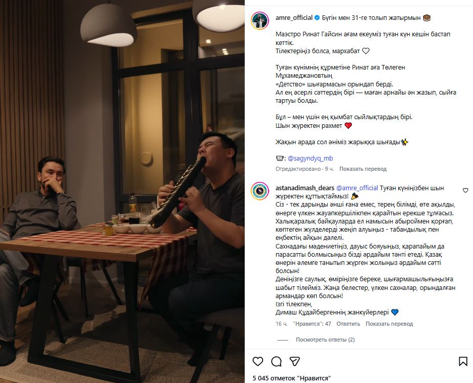 “В честь моего дня рождения Ринат Гайсин исполнил произведение Толегена Мухамеджановa “Детство”. Но один из самых трогательных моментов – это когда он написал для меня специальную песню в подарок. Это один из самых ценных подарков для меня. От всей души спасибо. В ближайшее время наша песня увидит свет”.