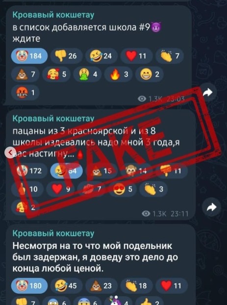 “Сообщения, распространяемые в социальных сетях о нападениях на учебные заведения города Кокшетау и обнаружении взрывного устройства, являются фейковыми и не соответствуют действительности. В настоящее время проводится комплекс мероприятий по установлению авторов данных сообщений”, — сообщили в департаменте полиции.
