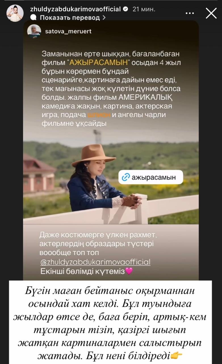 Сама Жулдыз, делясь отзывами фанатов, задается вопросом: почему именно сейчас люди начали анализировать плюсы и минусы картины, сравнивая ее с современными премьерами?