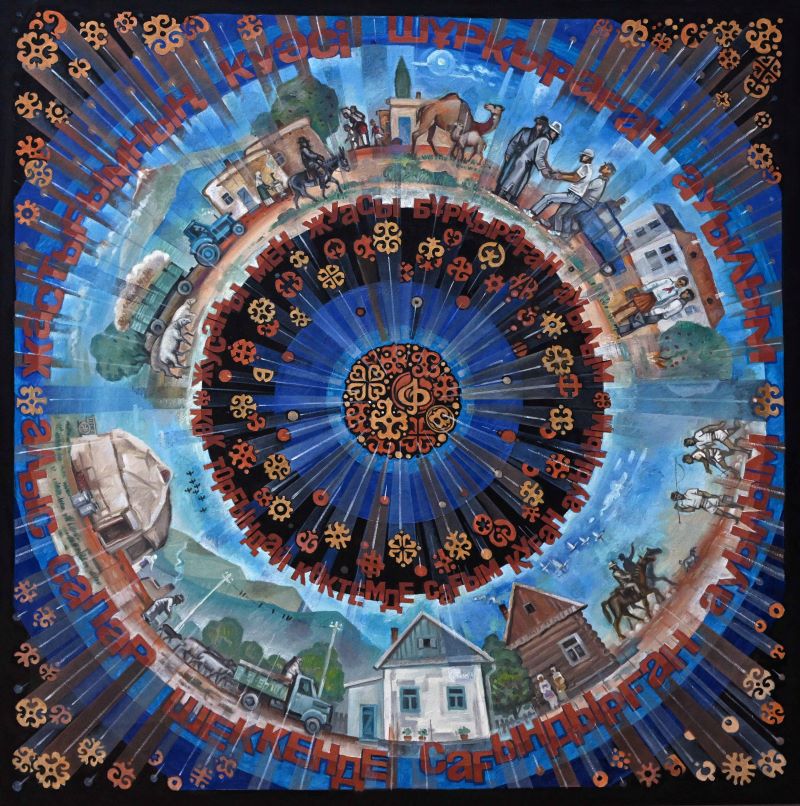 Мастер мыслит не картиной – пространством, и в нем зритель вдруг познает мироустройство. В работе «Родина» смыслы собраны аркой: внутри полукруга – мавзолеи, каменные изваяния, дерево-ось, не просто пейзаж, а сакральное ядро; снаружи – порт, вышки, трубы, индустриальный ритм, внешний мир, который меняется быстрее человека. Здесь нет конфликта древнего и современного – есть включенность одного в другое. Протяженная декоративная мозаика «Отдых» переводит голос в регистр фриза, где рабочие, семья, ребенок, хлеб, колосья и вода вплетены в орнамент так, будто культура сама учится дышать ровно – труд и отдых равноправны, человек не растворен в системе, он удержан в узоре. И отдельным аккордом – «Мать-легенда»: миф, рассказанный прикладным языком – текстильная плоть, ковровая логика, зверь-хранитель с детьми. В этом полотне древний архетип проживается без цитаты, через степной код – земля, память, защита.