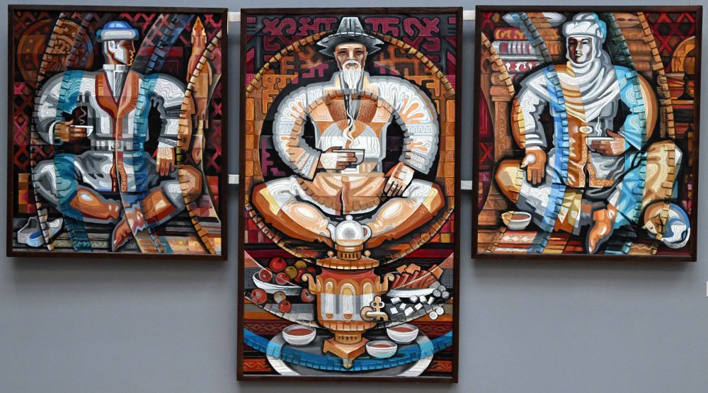 В зале густо от обилия красок. Стены дышат охрой, кобальтом, переливаются золотом. Воздух – с легким привкусом лака и старого дерева. Под ногами глухо шепчет свежий паркет. Делая шаг навстречу прекрасному, окунаешься глубже, чем в выставочный павильон – внутрь судьбы, где степь вращается по кругу, как на огромном медальоне, и всадники, будто поднятые ветром истории, несутся по замкнутой орбите. Круглая композиция – не просто декоративный жест. Это космос цивилизации, где движение – закон, а центр всегда удерживается усилием духа.