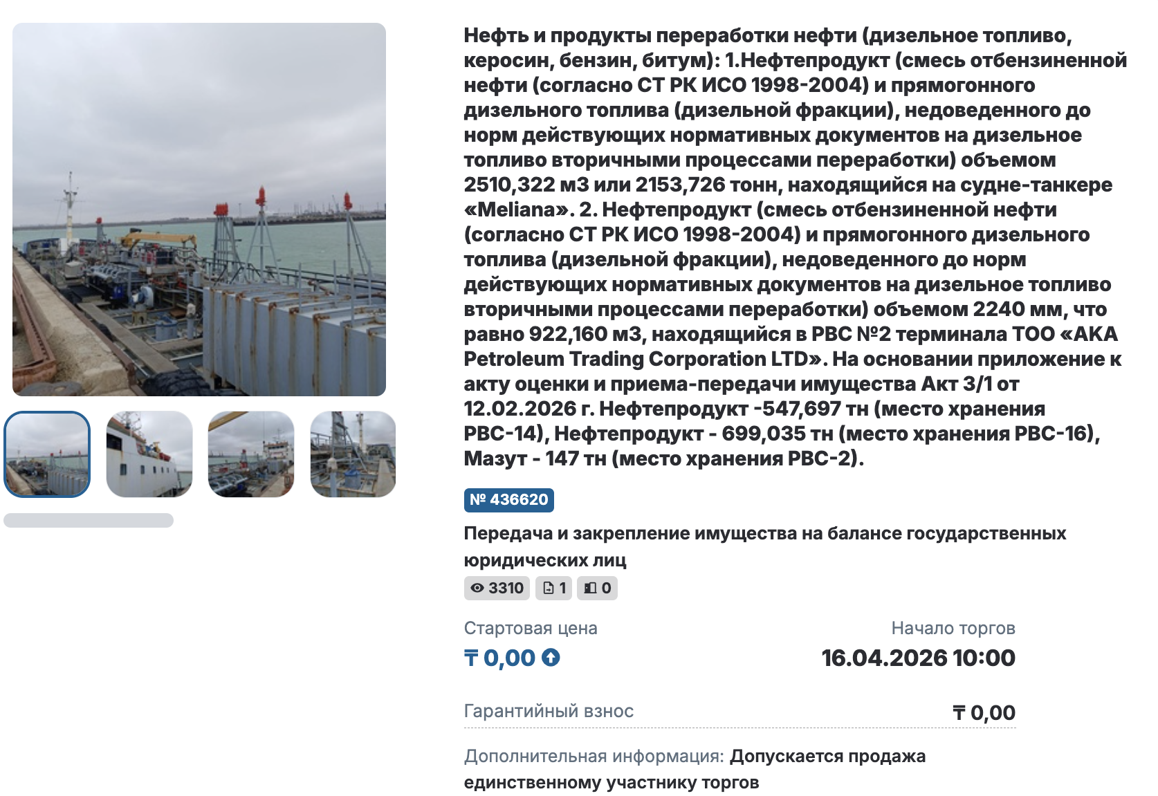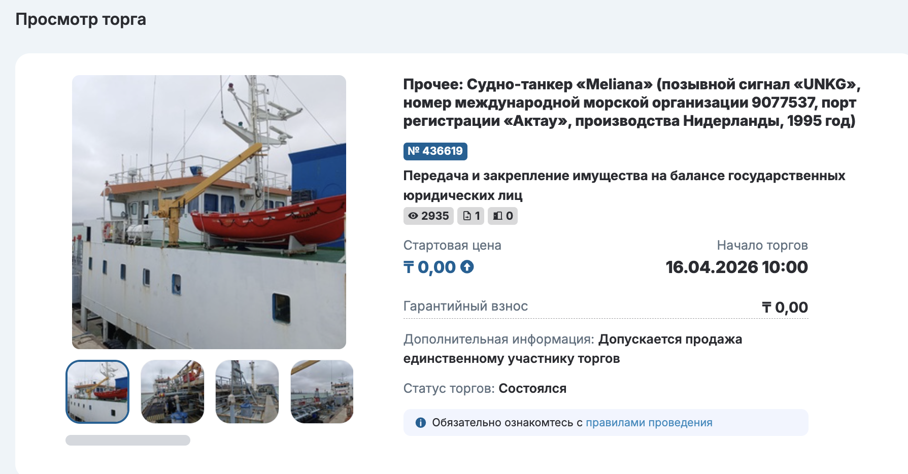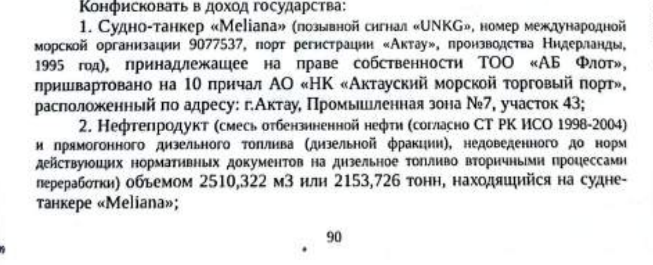 Танкер Meliana 1995 года выпуска, произведённый в Нидерландах обошёлся в 1,6 млрд тенге. Он пришвартован в порту Актау. Плюс государству достались нефтепродукты на борту, которые контрабандисты не успели продать: отбензиненная нефть, дизель и мазут ещё на 724 млн тенге.