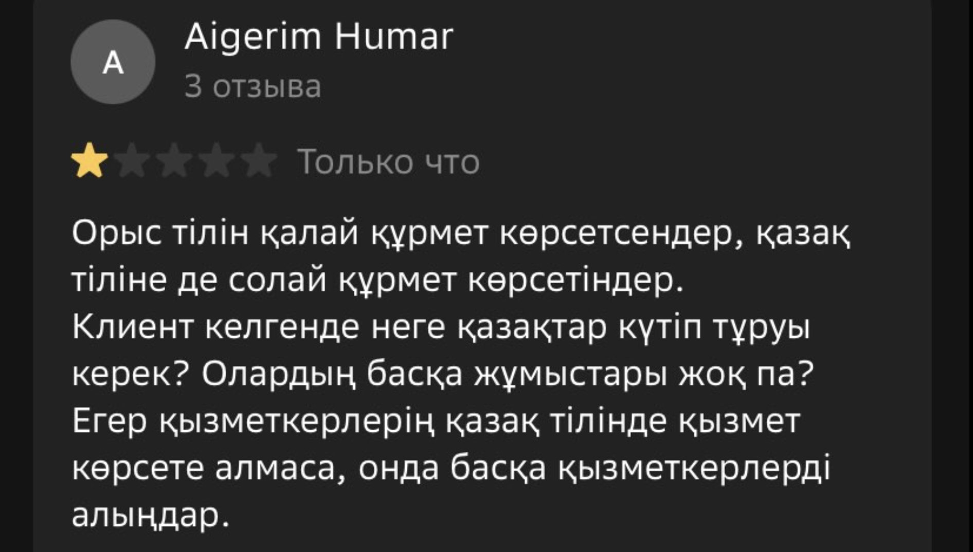 «Сначала я отправила дочь, сама сидела в машине. Дочка вернулась расстроенной — говорит, что ее будто не слышат и не отвечают. Моя дочь тоже говорит на казахском. Получается, эта сотрудница обслуживает только русскоязычных? Я зашла без негатива, без лишних слов, просто торопилась. Моя вина в том, что я говорила на казахском? Я что, не заслуживаю нормального сервиса только из-за языка?» — написала автор поста.