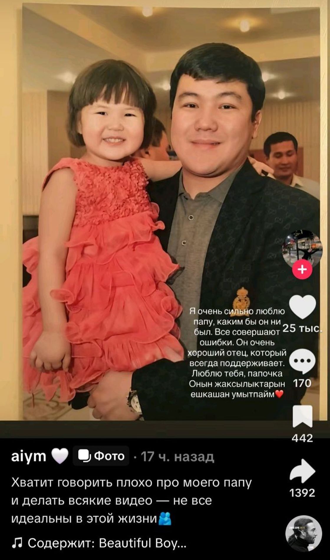 Турсынбек Кабатов с дочерью. Скрин: tiktok.com/@_aiymai.t