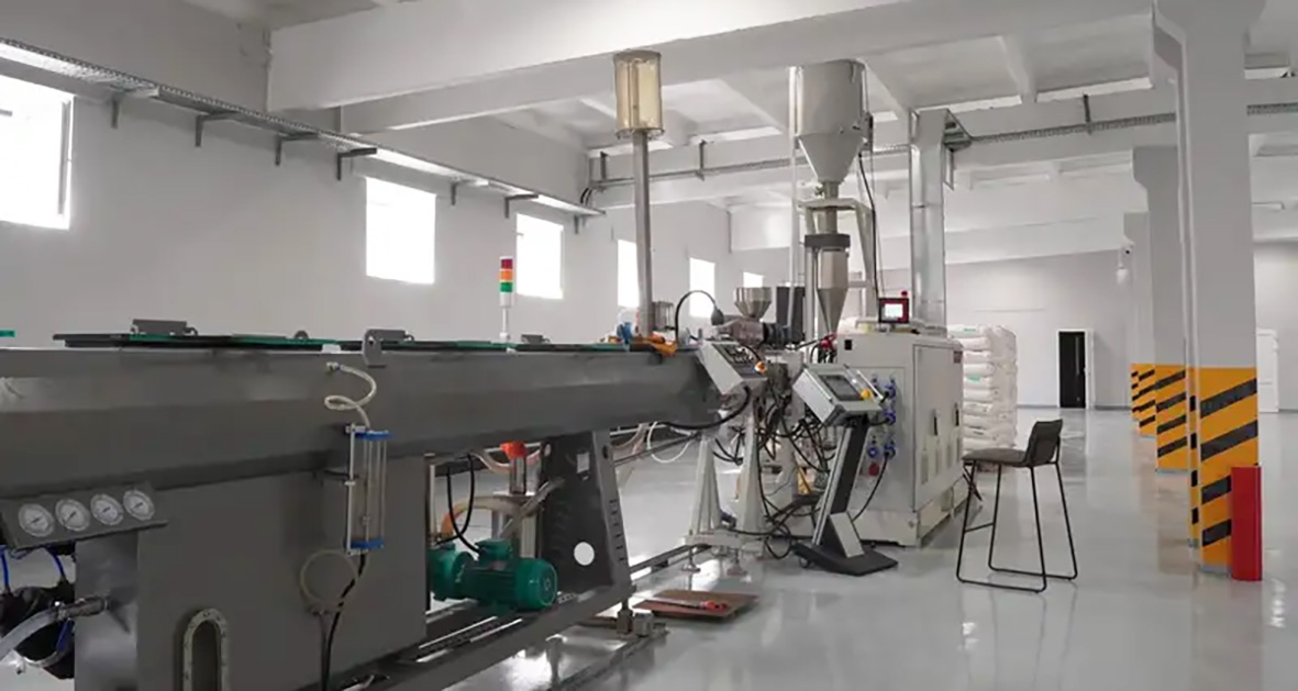 В основе технологического процесса производства полиэтиленовых труб здесь положен метод экструзии. Пневматика подает гранулированный полиэтилен высокой плотности в бункер экструдера, где порошок нагревается и под давлением в виде расплава поступает в прямоточную формующую головку. Оборудование обеспечивает прямое ровное продвижение полимера от шнека экструдера до выхода из мундштука. Тянущее устройство не просто перемещает изделие по всей линии, но калибрует-формирует толщину за счет регулировки скорости. Дальше труба проходит через систему охлаждения, включающую в себя водяные каналы. Этот шаг необходим для стабилизации формы и предотвращения деформации.