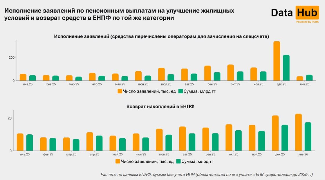 В декабре 2025 года наблюдались аномальные изъятия денег из Единого накопительного пенсионного фонда (ЕНПФ) на улучшение жилищных условий. Тогда было исполнено 339,1 тыс. заявлений на 221,4 млрд тенге. Количество заявок и сумма выросли почти в 3 раза за месяц.