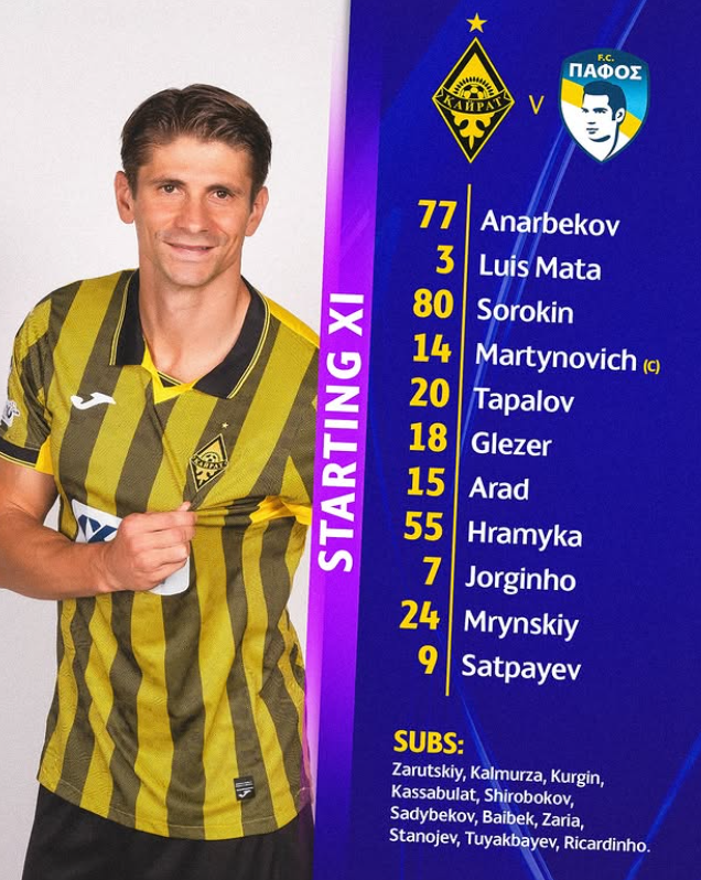 Стали известны стартовые составы «Кайрата» и кипрского «Пафоса» на матч третьего тура общего этапа Лиги Чемпионов, передает ИА «NewTimes.kz».