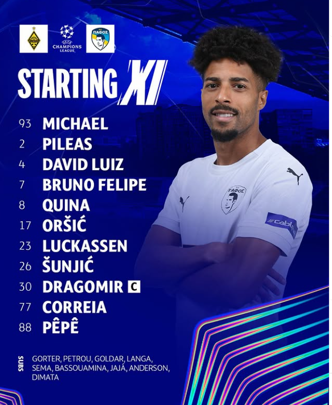 «Пафос»: Неофитос, Пилеас, Давид Луис, Лукассен, Бруно, Шуньич, Пепе, Оршич, Драгомир, Кина, Жоау Коррея.