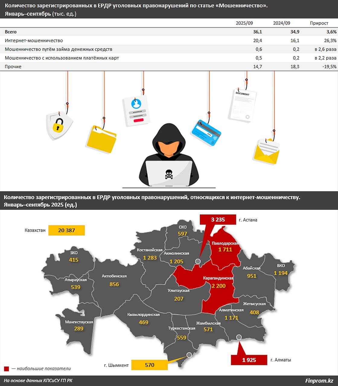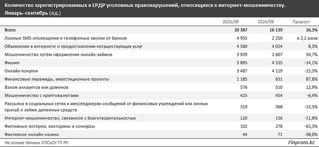Как сообщает Finprom, за девять месяцев 2025 года в Казахстане зарегистрировали 20 387 фактов интернет-мошенничества. Это сразу на 26,3% больше, чем было в прошлом году.
