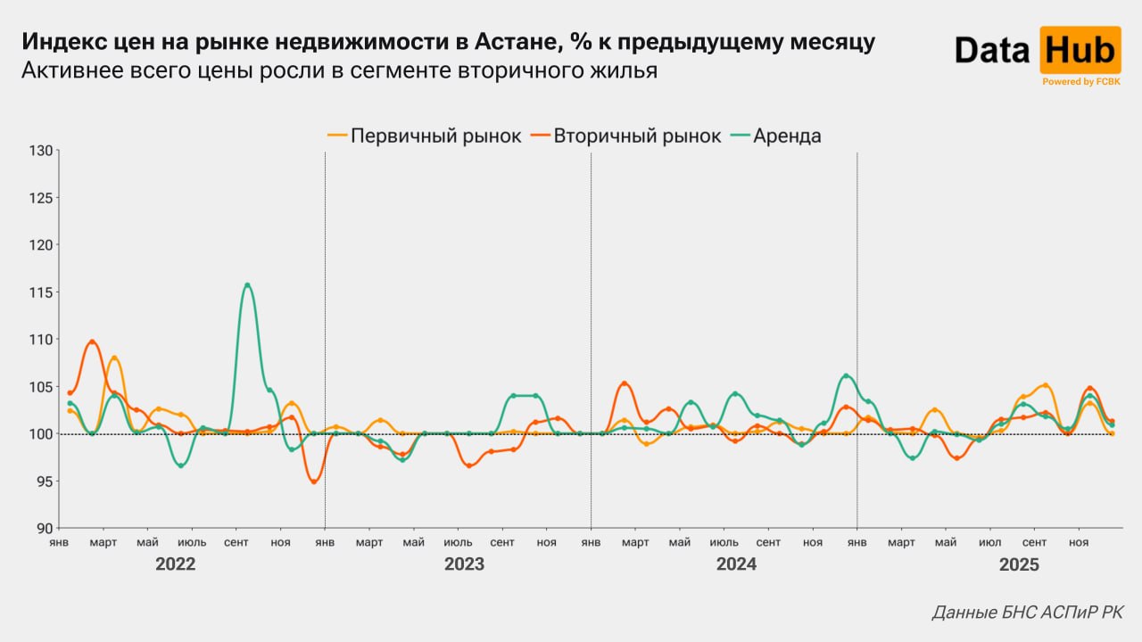 В Астане самым ощутимым был рост в сегменте перепродажи квартир, +1,3%, причём после резкого скачка в прошлом месяце. На первичном рынке динамики нет, аренда подорожала на 0,9% за месяц.