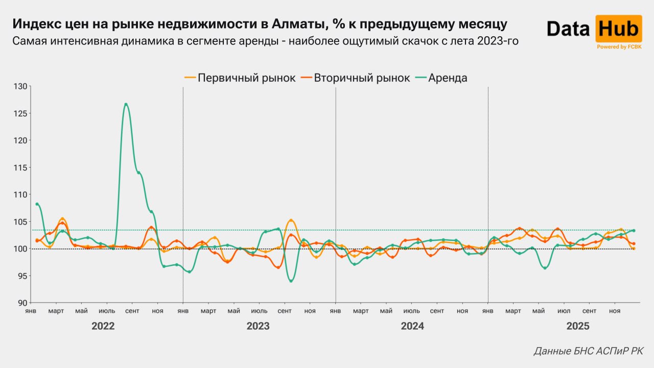 В Алматы наиболее интенсивная динамика – обнаружилась в сегменте аренды: +3,3%, это самый заметный скачок с августа 2023-го. На первичном рынке цены замерли, на вторичном прибавили 0,9%.