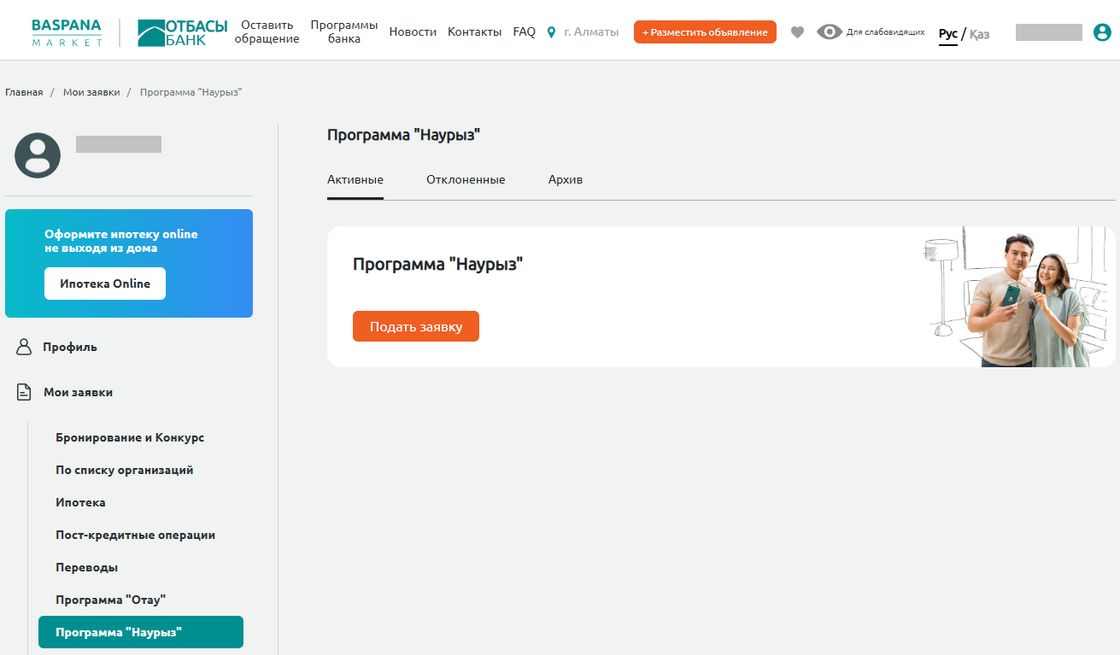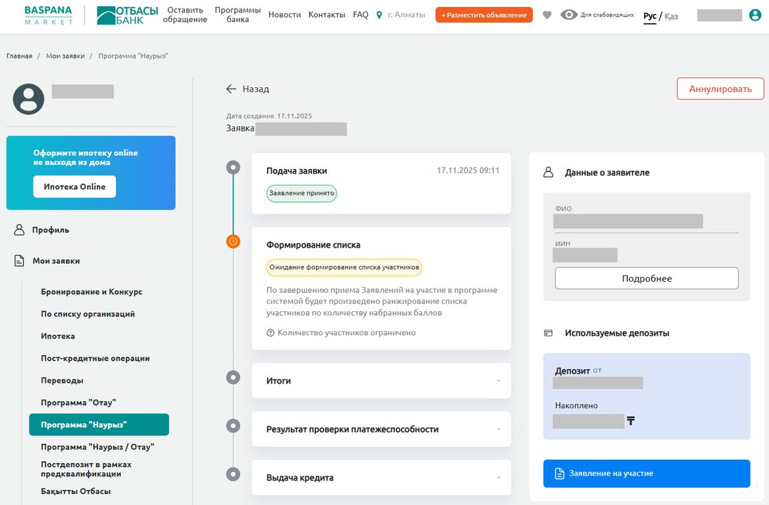 Подача заявки на ипотеку "Наурыз". Снимок экрана: портал Baspana Market