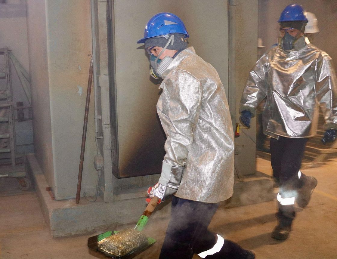 Финальной точкой маршрута становится плавка металла. В плавильном отделении демонстрируют результат трехдневной работы фабрики: золотой слиток весом 30 килограммов. При среднем содержании золота 0,8 грамма на тонну, чтобы получить такой слиток, необходимо переработать около 42 тыс. тонн руды.