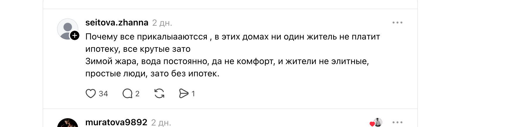 «Я живу здесь четыре года. Зимой очень тепло. Рядом хорошая школа Binom, удобная развязка, вокзал близко. Да, есть проблемы от застройщика, но жить можно», — говорит жительница Гаухар.