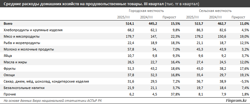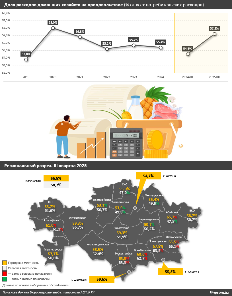 Жители Казахстана в июле – сентябре 2025 года тратили на продукты питания 57,2% от всех потребительских расходов, подсчитали аналитики Finprom.kz.