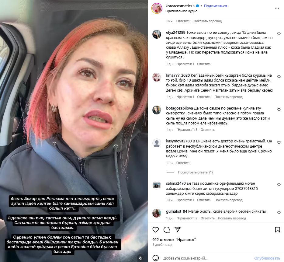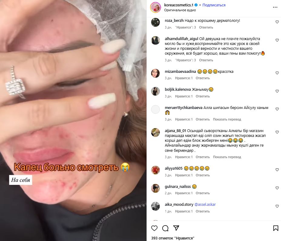 На опубликованных кадрах видно, что лицо девушки покрыто сыпью и покраснениями. По ее словам, такие изменения начались именно после использования рекламируемого средства. Под публикацией в соцсетях пользователи массово начали отмечать Асель Аскар, делясь аналогичными историями: