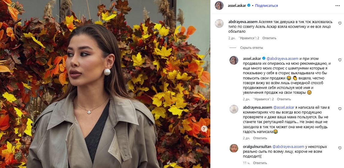 После волны комментариев сама Асель Аскар опубликовала ответ в своем личном аккаунте:
