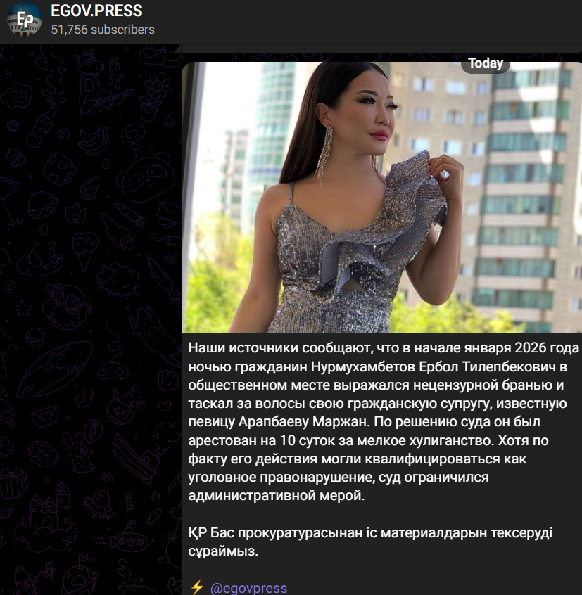 В социальных сетях распространилась информация о нападении мужчины на свою гражданскую супругу, певицу Маржан Арапбаеву, передает Liter.kz.