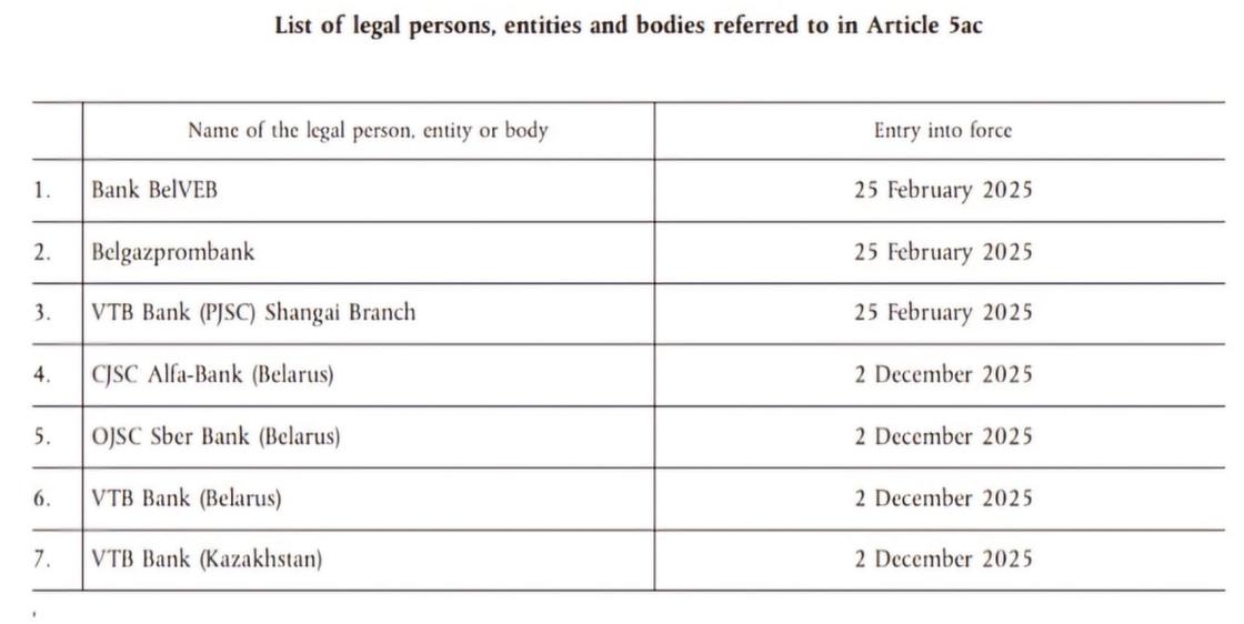 Согласно опубликованному на сайте ЕС документу, ограничения вступят в силу 2 декабря этого года. В их числе ограничения на доступ к финансовым услугам и операциям в юрисдикции ЕС.