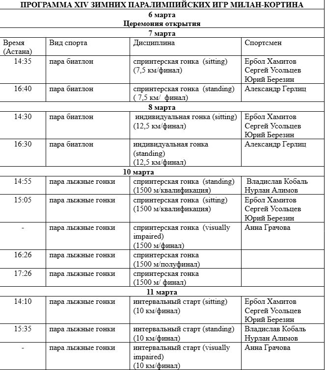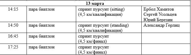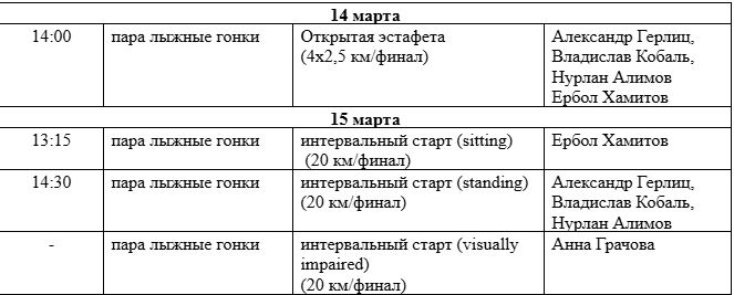 В соревнованиях по парабиатлону и пара лыжным гонкам выступят Ербол Хамитов, Александр Герлиц, Юрий Березин и Сергей Усольцев.