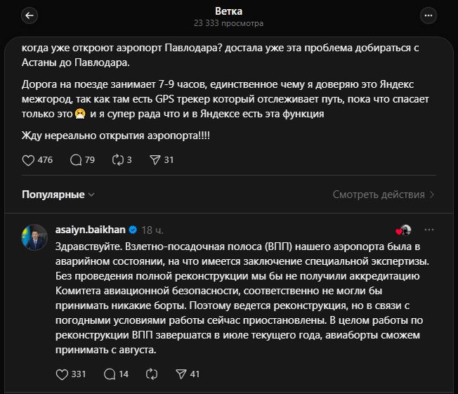 Жалоба казахстанки на закрытый аэропорт Павлодара неожиданно получила официальный ответ прямо в комментариях в соцсети Threads от акима Павлодарской области, передает Liter.kz.