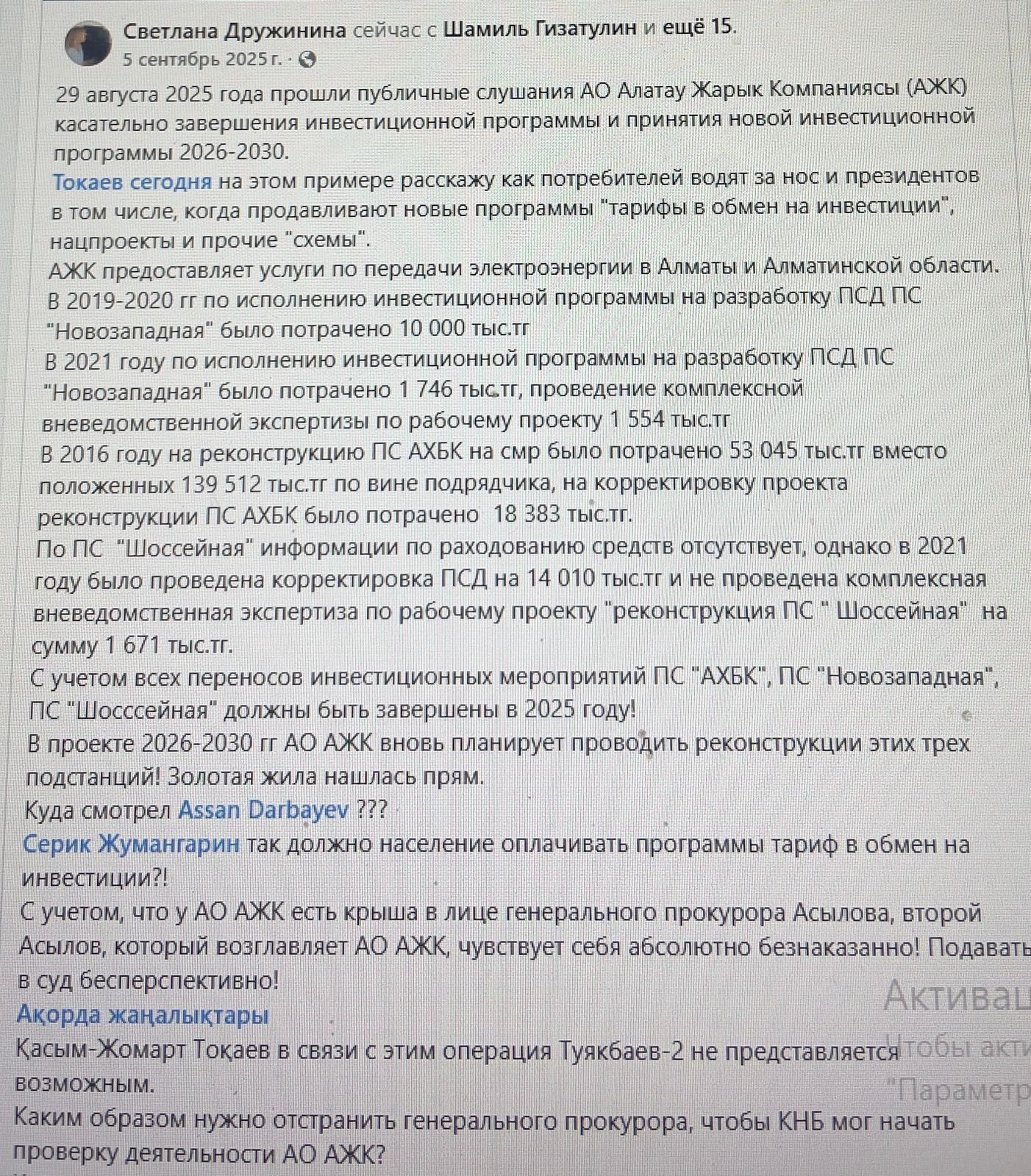 «По моим данным, расходы компании на содержание АСКУЭ только увеличиваются. Сейчас она тратит средства на всё что угодно, вплоть до улучшения программного обеспечения автоматизированной системы, однако счётчики не ставит. Я писала в сентябре 2025 года в фейсбуке пост про то, как АЖК обналичивает расходы на АСКУЭ. Там списываются миллиарды тенге. Хотела даже подать в суд на АЖК, но потом передумала. Когда твой родной брат — генеральный прокурор страны, то всё будет бесперспективно».