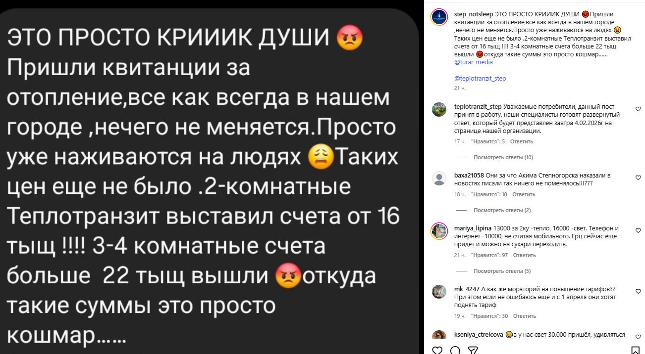 “Пришли квитанции за отопление... Таких цен еще не было. За двухкомнатную квартиру “Теплотранзит” выставил счета от 16 тысяч тенге, за трех- и четырехкомнатные – больше 22 тысяч. Откуда такие суммы, это просто кошмар”, – пишут жители.