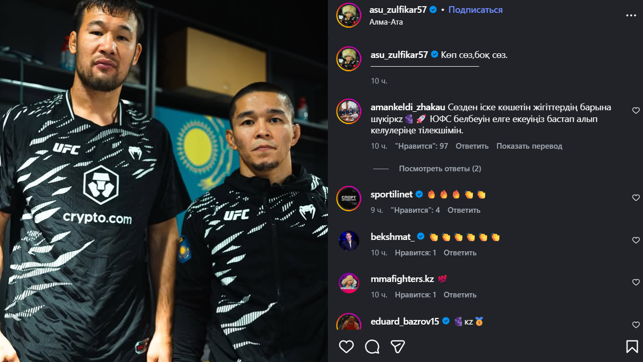 “Благодарен, что есть ребята, которые переходят от слов к делу. Желаю, чтобы вы вдвоём первыми привезли в страну пояс UFC”.