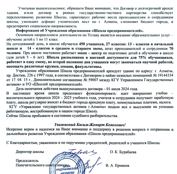 Бурабаева говорит, что всё это время школа арендовала здание, которое принадлежит акимату Алматы. По её словам, 1 июля 2024 года договор аренды не продлили, а суд не признал его действующим. Но школа продолжила платить за аренду и полностью содержать здание. Она подчёркивает, что потом объект передали управлению строительства, после чего начали обсуждать его реконструкцию.