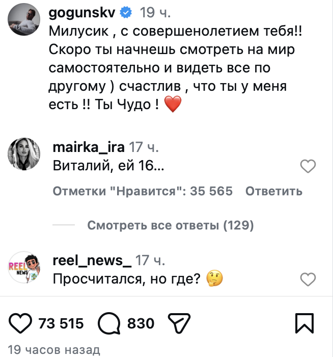 "Милусик, с совершеннолетием тебя!! Скоро ты начнешь смотреть на мир самостоятельно и видеть все по другому) Счастлив, что ты у меня есть!! Ты чудо!" — написал Гогунский.