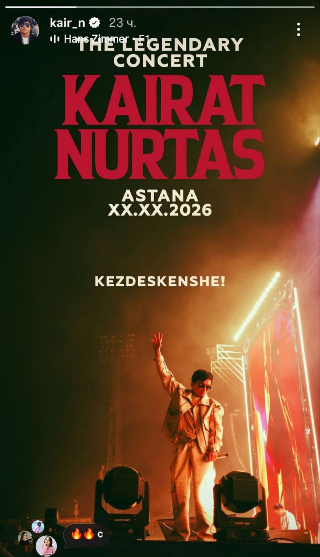 "Легендарный концерт Кайрата Нуртаса. Астана. XX.XX.2026. До встречи!" - отмечено в постере.