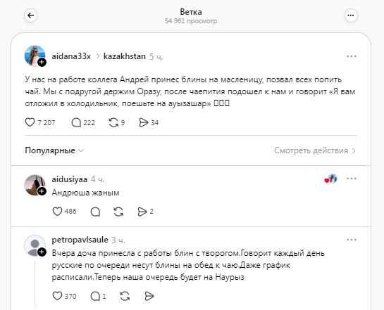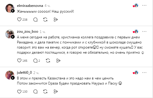 В комментариях казахстанцы рассказывают о собственном опыте взаимной поддержки. Одни пишут, что угощают коллег на ифтар, другие — готовят блины и баурсаки для всех вне зависимости от религии. Многие отмечают, что подобные жесты — это не просто проявление вежливости, а отражение культуры уважения и добрососедства.