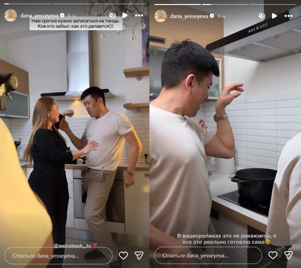 “В видеороликах это не реквизиты, я все это реально готовлю”, – написала она, стоя у плиты вместе с Мейржаном.