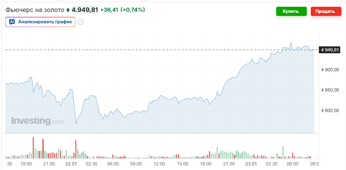 Мировые цены на золото приближаются к отметке в 5000 долларов. На открытии торговой сессии 23 января стоимость драгметалла достигала отметки в 4954 доллара – исторического максимума.