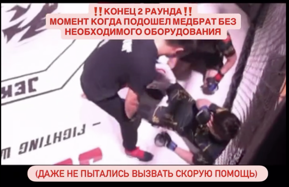 Боец не смог продолжать бой. Однако, как далее следует из объяснений, ни рефери, ни организаторы не остановили выступление.