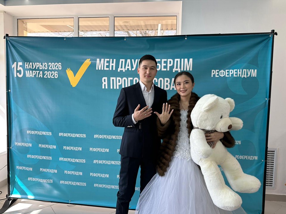 Молодожены Бекнур Несипбек и Альмира Мажитова в день своей свадьбы проявили гражданскую активность и пришли на избирательный участок №202, чтобы принять участие в голосовании, передает Liter.kz.