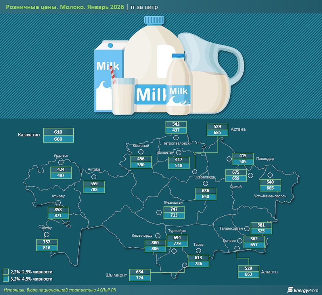 Средние цены на молоко в городах Казахстана. Инфографика: energyprom.kz
