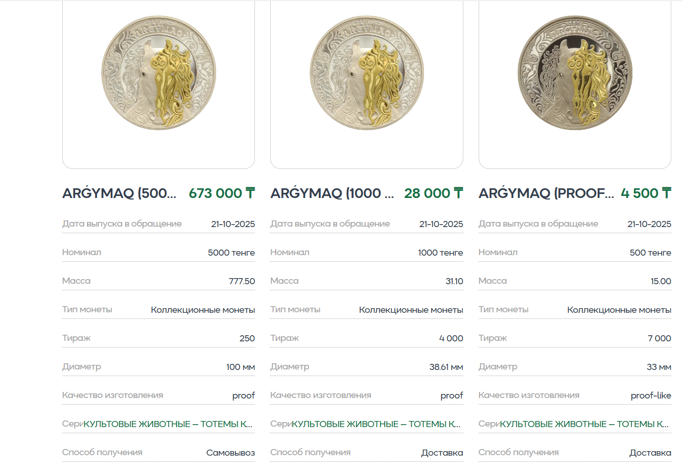Коллекционные монеты можно купить на официальном сайте НБРК. Те, что номиналом в 5 тысяч тенге, можно купить за 673 тысячи тенге, 1000 тенге – за 28 тысяч тенге, 500 тенге – за 4500 тенге.