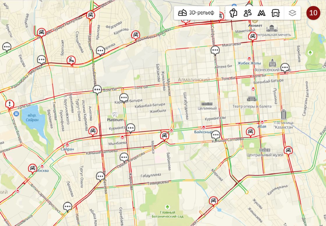 По информации 2ГИС, на 17:50 в Алматы ситуация с пробками оценивается в 10 баллов. Движение парализовано на центральных улицах города.