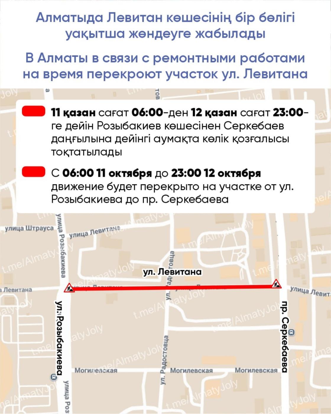 Жителей Алматы предупредили, что движение будет перекрыто на участке по улице Левитана - от улицы Розыбакиева до проспекта Серкебаева. Ограничения будут действовать в выходные дни - с 06:00 11 октября до 23:00 12 октября.