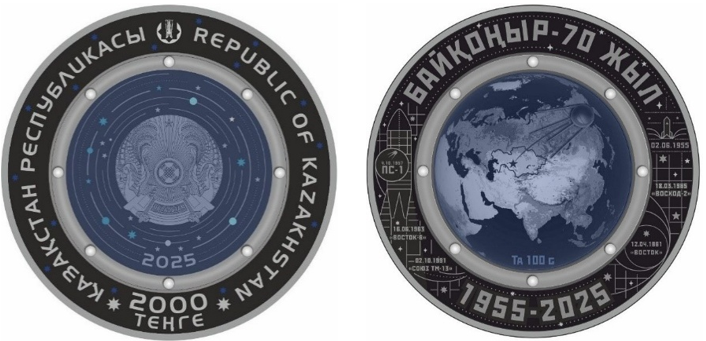 Монета “БАЙҚОҢЫР - 70 ЖЫЛ” изготовлена полностью из тантала, с применением на аверсе монеты технологии нанесения скрытых изображений, видимых под ультрафиолетовым свечением, тираж изготовления – 500 штук.